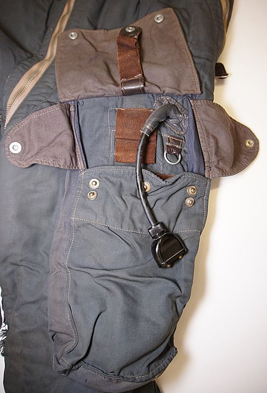 This example is of the very early specification as identified by the horizontal crutch zip fly, as in June 1940 it was replaced by a more practical vertical zip. The other distinguishing feature of this pattern was a map pocket, closed with a vertical zip fitted on the left chest. Perhaps the most striking difference between this suit and the second pattern is the map pocket was replaced by a vertical emergency opening device operated by a pull ring, to enable the suit to be removed quickly on occasions when the airman was injured.