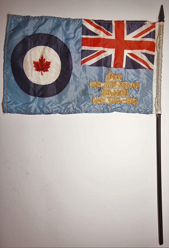 RCAF 434 'Bluenose' Squadron Commemorative Flag - This one presents a bit of a mystery! It tuned up in a house clearance in Durham back in 2011 when we acquired it and has remained tucked away in our stock room ever since, pending research! The flag which is an RCAF ensign of standard design and similar to the RAF ensign but with the addition of a maple leaf to the centre of the roundel. It is we believe made of nylon and is of the printed variety. What adds special interest is the addition of machined embroidery, picked out in yellow reading WL-K R. C. A. F. Sqd.434 ENGLAND FEB-JULY 1944. 434 Squadron was one of the 15 that were stationed at various airfields in the County of Yorkshire, England as part of RCAF 6 Group. 434 were also known as the "Bluenosers"; the squadron was adopted by the Rotary Club of Halifax, Nova Scotia and took the nickname "Bluenose" in reference to the common nickname for Nova Scotians. The Squadron motto reads "IN EXCELSIS VINCIMUS" which translated means, most approparately, "WE CONQUER IN THE HEIGHTS". Initially formed on 13th July 1943 and based at Tholthorpe but transferred to Croft in December '43 where it remained for the rest of the war. Looking at the map Croft airfield was in County Durham and just 25 miles (40K) from Durham where the flags tuned up, so we surmise these were produced for a commemorative event at Croft at a date unknown.