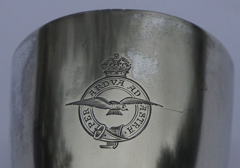The cup is stamped EPNS to the base and numbered 33288; much of the electro plating has now worn away after 95 years of polishing, but it still makes an impressive display piece from the very early days of the RAF. The front is engraved with a good crisp RAF crest with the 'Per Adua Ad Astra' legend, the RAF eagle and surmounted by a Kings Crown. The opposite side is engraved 'RAF No 7Group Novices Championship 1925 Light Weight Special Contest Runner Up'. Whilst the cup comes without specific provenance we have assumed it was awarded for a lightweight boxing championship back in 1925, but we stand to be corrected. The cup, which stands a fraction over 6" tall (15.5 cm) is in generally good condition other than the odd bump and ding commensurate with its age (like us all! Editor)