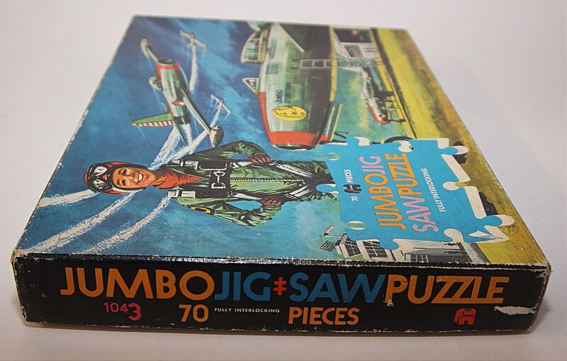 Jumbojig F-84 G 'Thunderjet' Jigsaw Puzzle - Now for something completely different! Here we have an aviation themed jigsaw puzzle, complete with its original packaging, which retains all its 70 interlocking pieces. Made up the puzzle depicts an image of a Netherlands Airforce F-84G Thunderjet that carries nose art on the aircraft in the foreground stating 'Jumbo Stunt-Team'. Research indicates the Netherlands Airforce started operating the US made Thunderjet in 1955 and served with 306, 311, 312, 313, 314, 315 and 316 Squadrons, until being retired in December 1970. The type was an American turbojet fighter-bomber aircraft, developed 1944 and first flew in 1946 with the United States Army Air Force.