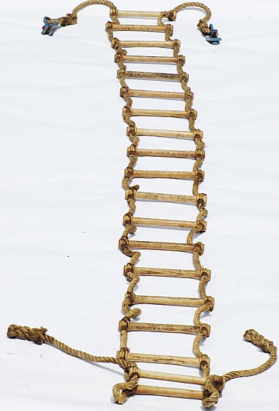 Heavy Duty Rope Ladder - Whilst we have no history with this one looking at the manufacturing quality we believe it to be ex marine issue and possibly Royal Navy. Whilst we say 'issued' the ladder is so good we wonder if it actually ever left the stores? The coir rope looks to be in really good condition and is made up of 20 hardwood steps; we believe the wood to be ash but stand to be corrected. The 20 rungs are mounted with each rung 1 foot apart (30 cm) and the extended length of the ladder is 21 feet (6.4 meters).It is 12" wide (30 cm)and at the top end it has two metal fittings designed to bolt the ladder on to a suitable secure attachment point. It is very decorative item and is a real designers piece or perfect for theatrical or film use. This item, like all stock offered on our site, is sold for collectable purposes only. It could well be it is strong enough to be used for its original intended purpose but we can't guarantee this so if this is your intention re strongly recommended you get it checked out by a suitably qualified person first. More detailed pictures can be supplied on request.