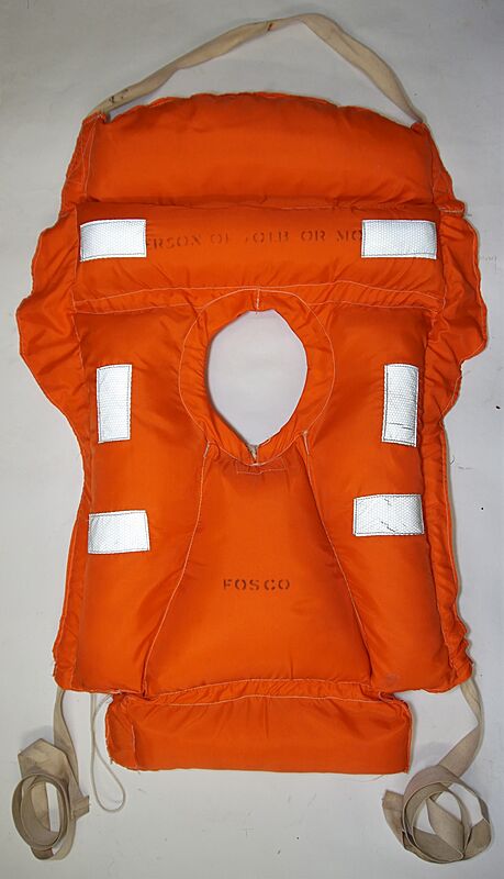 Vintage Department of Trade Standard Lifejacket - An original Department of Transport issue ships life vest stamped 'Standard', 'Front' and for 'Persons of 32 kilos or more' and the same message on the reverse indicating 70 Lbs. It is also stamped 'FOSCO' who we assume was the manufacturer. It appears to be kapok filled and the outer is finished in a dayglo orange cloth with reflective strips. It carries a DT acceptance stamp for September 1982 but despite being nearly 39 years old it is in very good issued condition. It comes complete with various straps and a Mk II Perry emergency whistle which is attached to a lanyard, for attracting attention at night and all original securing straps.