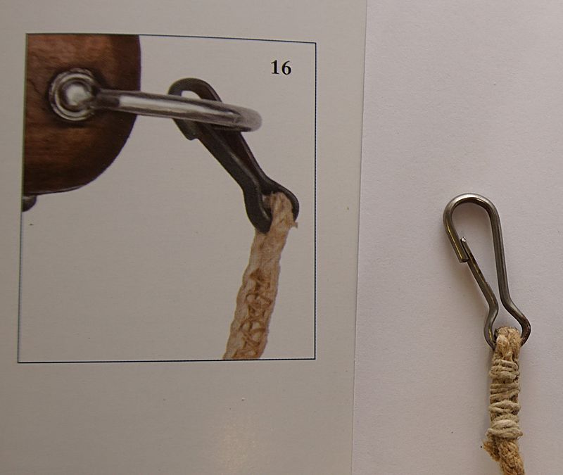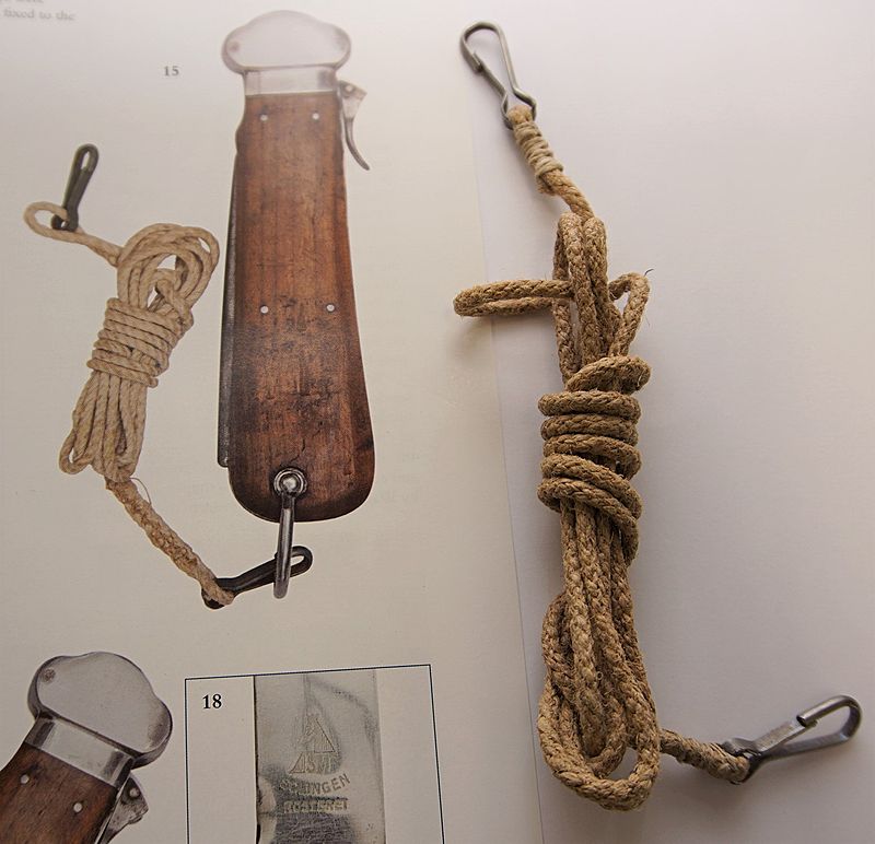 | Luftwaffe Gravity Knife Lanyard - Whilst convincing replica lanyards exist originals hardly ever come on the market, but this is one such occasion. This is an early pattern that was found in the pocket of a set of period Channel Trousers and is entirely new to the market. The lanyard is fitted with metal clips either end (research indicates late war examples only carried a single clip due to material shortages) with one end designed to attach to the swing loop of the 'Fliegerkappmesser', that was introduced for use by both parachutists and aircrew in 1937. The other end was fixed to a loop inside the pocket of the 'Kanal' trousers to secure it in an emergency. The woven beige cord remains in absolutely sound condition with the metal clips being secured by a looped and whipped end. The inner sprung edge of the clips features a serrated pattern, which is a further sure sign of an original lanyard. The extended length is 56" (142 cm).An identical example is illustrated on page 321 of 'Deutsche Luftwaffe' (as illustrated here). In 20+ years of trading this is the first original lanyard we have had in and is competitively priced seeing its scarcity and rather better value than a second pattern example currently on offer elsewhere at EU 345 whilst another sold on US E Bay in May 2018 for $250.00