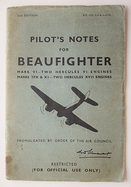 RAF Pilot's Notes for Bristol Beaufighter Mk VI, TEX & X1 The Beaufighter prototype first flew in July 1939, just six months after the layout drawings had been agreed and was met with an order for 300 aircraft, under Specification F.17/39. Entering service in July 1940 it operated as a night fighter in the Battle of Britain. Robust, versatile and heavily armed, the Bristol Beaufighter operated in many roles and theatres, remaining in RAF service until 1960 and when withdrawn from service 5,928 had been manufactured. The Mk VI featured Hercules X VII engines and over 1,000 examples of this model were built. The TFX variant was a torpedo fighter aircraft, dubbed the "Torbeau" whilst the Mk XIC was supplied to Coastal Command. These pilot's notes, like the Lancaster version also listed today, is a scarce original copy dated January 1944 and is a second edition A. P.1721. The cover is named in feint pencil to a F/Sgt K. R. ………., the final lettering of which we have been unable to decipher.