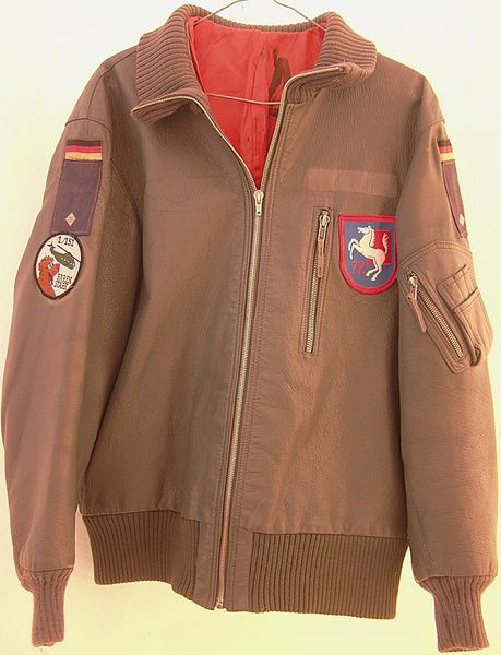 Luftwaffe Grey Leather Flight Jacket - This example features a so far unidentified cloth patch to the left breast, showing a prancing horse and the number 72. On the left shoulder is a further badge embroidered 1/151 and Baren Stark and an image of a helicopter which we believe to represent a Sikorsky CH-53 Sea Stallion. A winged badge as well as a name tag have been removed from the jacket. It also carries rank tabs and the national flag. Inside the zip pocket an original issue label indicates the size as a GR 9 which we estimate would comfortable fit chest size 40-41" (100-104 cm). The jacket was manufactured in May 1988. Knits and zips all in good shape and a very practical and wearable flight jacket.