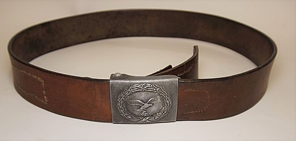 Luftwaffe Other Ranks /NCO leather belt - Fitted with original 1940 pattern die stamped, steel combat box buckle; pre-war examples featured a fully pebbled alloy buckles but these were superseded around 1939 or 1940 by the steel variant. This example features a smooth outer field with a central embossed high relief oval with pebble finish, inside a laurel leaf wreath surround. The Luftwaffe eagle, with outstretched wings clutching a canted swastika in one talon to the centre and is of the second pattern with good crisp definition. Some of the original dark field grey paint remains to the front but is largely worn away. Earlier buckles carried a short leather tab attached to the buckle roll bar to serve as a catch for the right-side ammunition pouch, but by order OTB 42, No.54 of 28th March 1942 this was abolished, as a material saving aid due to war shortages and this is correctly omitted from this buckle.