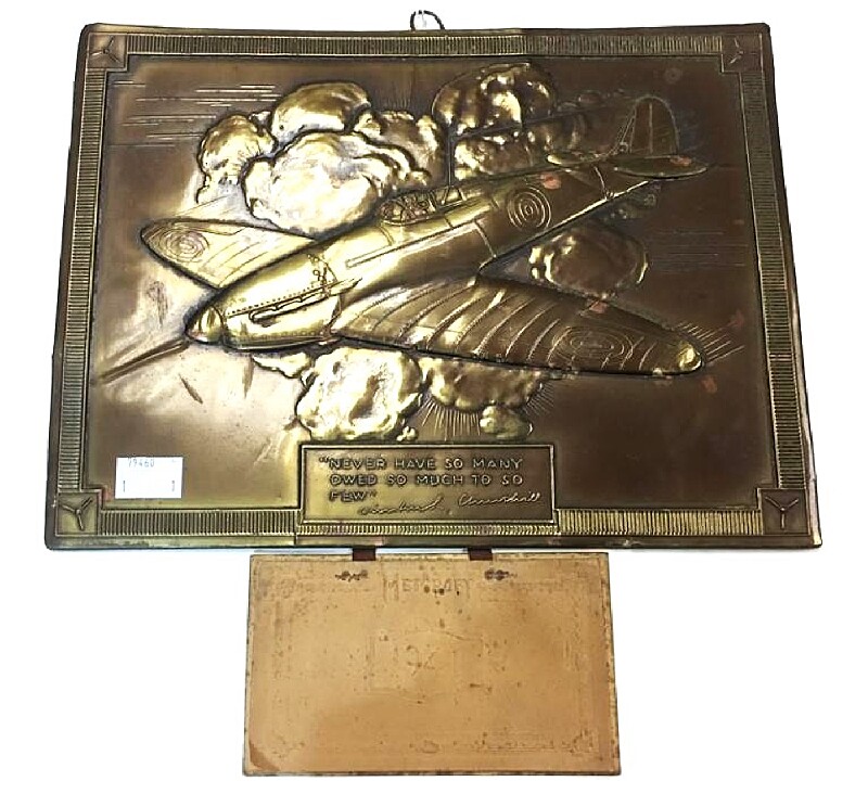 WWII Battle of Britain Spitfire Plaque by 'Metcraft' Production - A fine WWII survivor and souvenir of the Battle of Britain. These were produced by the Walsall Lithographic Co Ltd under a patented process called 'Metcraft '. When originally sold they carried a small paper calendar below the image. Examples we have seen of this design are almost always missing their calendar and we surmise, when the year in question concluded, the calendar was torn off but the very fine Spitfire plaque was retained as far to good to put in the waste bin! The plaque is made from a rectangular card-backed pressed brass foil, featuring a Mk I Spitfire in flight and part of Winston Churchill's famous speech to the House of Commons honouring 'The Few' "Never Have So Many Owed So Much To So Few", that was made on 20th of August 1940. Below the speech exert is a facsimile of Churchill's signature. The production of these calendars must have started in late 1940, to be retailed in 1941, but we are uncertain if they were offered just that year or if they continued into the later war years. The final images attached in the photograph section shows a similar plaque with the 1941 calendar still in place followed by the detail from April 1941. This is for reference purposes only and ours is offered without calendar.