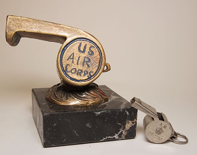US Army Air Corps Presentation Whistle - We endeavour to offer unusual and unique items and this is certainly the first time we've seen one of these! The item incorporates an oversized ceramic whistle marked US Air Corps to one side and USA on the other, while the top is embossed with Army Air Corps. The USAAC was established in 1926 and was abolished in June 1941 when the USAAF was formed, so it seems likely this dates from betwen 1926 and 1941. The whistle is realistically finished in a bronze colour with blue lettering and is attached to a heavy marble base. We believe it could well have been a presentation item and perhaps to be used as a paperweight on an officer's desk or maybe as a display item in the military store. The whistle itself measures 3.5" (9 cm) and including the base it is almost 4" high (10 cm).The final image attached shows it diplayed alongside a regular Air Ministry snail whilst that clearly shows this is an impressive display piece! If any visitors can give us a more accurate description, please let us know and we will add to the listing.