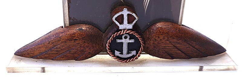 WWII Fleet Air Arm Lucite Trench Art Picture Frame - A particularly impressive example, largely constructed from Lucite, that was also called Plexiglas, and was used for making aircraft canopies in World War 11. Clearly some scrap material has been made up into a transparent picture frame, that features a photograph of a Royal Naval Rating, dressed in his no 1 uniform, in what looks to be a studio portrait; the photo has some age related marks, but still displays well. The front panel of Lucite slides out of the frame so the photograph can be removed, as shown. Very sadly it is not named, so the provenance of the piece has been lost down the years. On the base is a set of Fleet Air Arm pilots wings, hand carved from hardwood, with inset a naval anchor and a Kings Crown above. Our assumption is this sailor became an FAA pilot, flying with the Royal Navy in WWII. The only additional clue we have is a pencil number on the back of the photograph that is probably a studio reference, so no great help in our research. This is one of the better executed pieces of trench art that we have had in for quite some while, so grab it whilst you can! Measures 6" x 4.6" (15 cm x 11.5 cm)