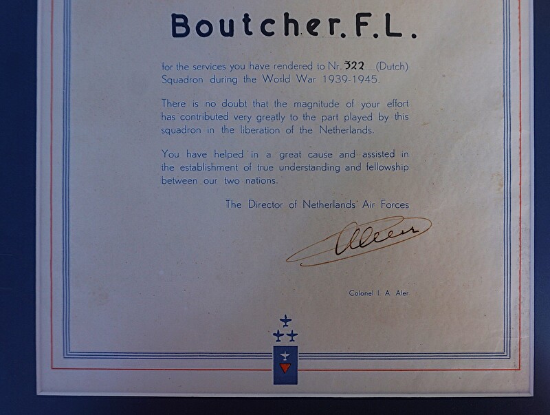 This original certificate was presented by Colonel I. A. Aler on behalf of the Kingdom of the Netherlands to Frank Lawrence Boutcher, who served with 322 Squadron as a flight mechanic and later transferred to Bomber Command and promoted to Fitter, servicing Stirling and Halifax heavy Bombers. Whilst working on the latter an engine caught fire and he beat the flames with his hat! Subsequently he was posted to the Air Sea Rescue Training Centre and eventually going to Calshot in Hampshire to work on rescue boats. Interestingly he was interviewed for the Bomber Command Digital Archive in 2018 that can be accessed via this link, that tells his wartime story in his own words.