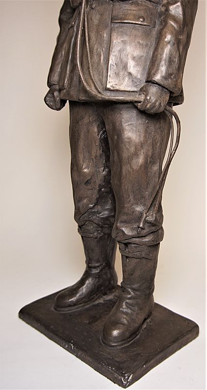 The Battle of Britain Pilot - On this item and other sculptures offered, we are acting as agents and your enquiry will be redirected to the artist who will then handle any questions, sales, payment and despatch. This sculpture entitled 'The Battle of Britain Pilot' personifies a typical fighter pilot at the start of WWII and is characteristic of the Battle of Britain period. He is wearing a crumpled service dress uniform standing looking into the sky with an air of youthful defiance that earned these young men Churchill's accolade 'The Few'. His flying helmet is the iconic RAF B type with bulbous receiver carriers and is fitted with a D type constant flow oxygen mask, E type microphone dating from 1935 and the detail even extends to the 6D/101 connector and RT cable and bell plug. His goggles are the Mk IIIA of pre war design, whilst his flying boots are 1936 pattern which were jealously guarded by fighter pilots of the period. He also wears a 1932 specification Mae West lifejacket which often proved a lifesaver in the event of a bail out over or a ditching in the English Channel. We are proud to have assisted the artist as technical consultants in the creation of this work of art which is made from cold-cast bronze, is signed by the artist and is available in a strictly limited edition of 250. Height: 16" (41 cm)