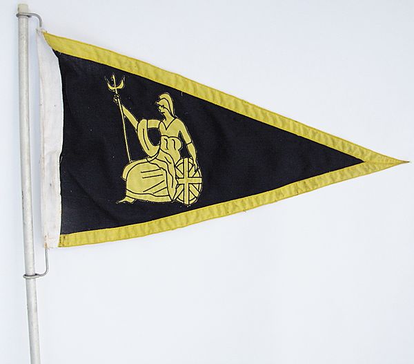 'Britannia' Yacht Pennant - A very fine and imposing example mounted on an aluminium mast. The yellow Britannia image is sewn onto the navy blue cotton background and not simply printed as on many examples we see. Sadly we have been unable to identify the club to which it was associated and the closest we can find is the British Kiel Yacht Club although their design is not the same as ours. If any visitors can help us with an identification please get in touch and we can add it to our description. The pennant measures 18" x 11" and the flag staff is 48 1/2" long (124 cm) so would have been used on something rather lager than a Mirror dinghy! It would sit very proudly atop the mast of the classic 1930's ocean-racing yacht Bloodhound, which was owned by Her Majesty The Queen and Prince Philip in the 1960s and aboard which Prince Charles and Princess Anne learned to sail and is operated today by The Royal Yacht Britannia Trust.