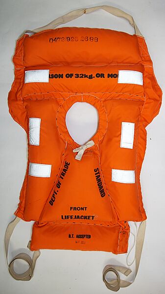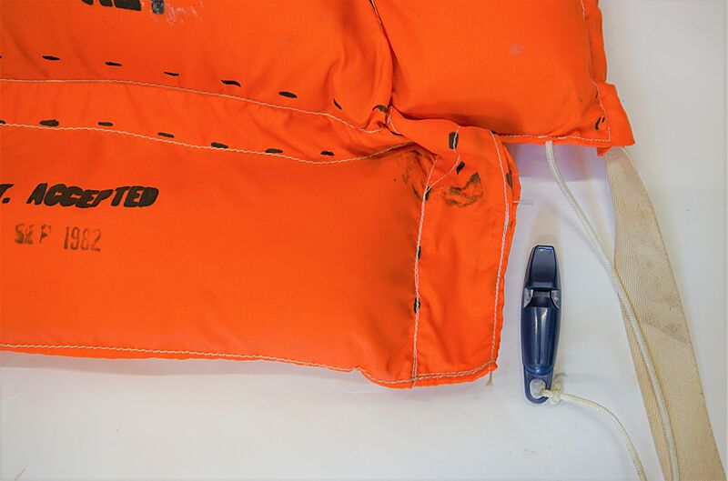 Vintage Department of Trade Standard Lifejacket - An original Department of Transport issue ships life vest stamped 'Standard', 'Front' and for 'Persons of 32 kilos or more' and the same message on the reverse indicating 70 Lbs. It is also stamped 'FOSCO' who we assume was the manufacturer. It appears to be kapok filled and the outer is finished in a dayglo orange cloth with reflective strips. It carries a DT acceptance stamp for September 1982 but despite being nearly 39 years old it is in very good issued condition. It comes complete with various straps and a Mk II Perry emergency whistle which is attached to a lanyard, for attracting attention at night and all original securing straps.