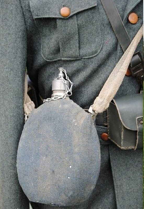 The water bottles MN badge is the surrounded by 15 engraved names of port towns and cities, which we surmise charts the travels of the new owner in WWII. As well as Gibraltar and Malta other countries visited include Algeria, Tunisia, Libya, Italy and of course Sicily. The reverse side carries a further 6 towns, being Torre Annunziata, Bougie, Naples, Bari, Algiers and Anzio and below is a large engraved harp. Clearly the harp features on the coat of arms of Eire and on the ensign of the Irish Merchant Navy, but as southern Ireland was neutral in WWII we believe this represents something else and as a pure guess it is a symbol to give the owner the fabled 'luck of the Irish'? The alternative we have come up with is it represents the insignia of the London Irish Rifles, who are confirmed as serving at Salerno in 1943 and later in the Italian campaign in 1944. If any visitors can enlighten us with a more scientific explanation, we will add details to our description.