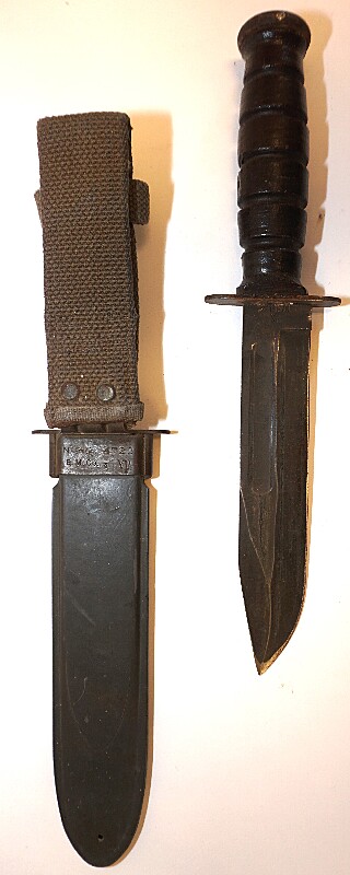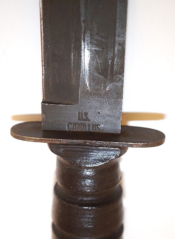 The Ka-Bar was both a utility knife and a fighting weapon and this example being USN issue may have been used by Navy Aviators, but often were mostly used for everyday functions aboard ship and ashore. They were Navy issue throughout WWII and remained an inventory item through to the Vietnam war. The origin of the name Ka-Bar is unknown, although some believe it relates to a boast from an early user that the knife could "kill a bear. "Others adhere to a more military interpretation, maintaining that the name stands for "Knife Attached—Browning Automatic Rifle. "Marines dependeded on their Ka-Bars as camp implements, useful for prying lids off crates, driving nails and digging holes and many issued examples that survive bear evidence of such usage
