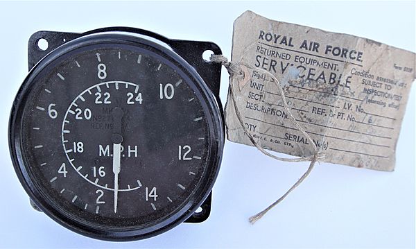 | RAF Air Speed Indicator Mk IXA - The Mk IXA instrument (the 'A' signifying the dial is non-luminous) entered service in the 1930'sand replaced the V series of instruments and was the first to have a bakerite case and was standard fit in most British aircraft in WWII. Numerous versions were made each with a different speed scale; in this instance the speed is marked in M.P.H. as opposed to Knots and the scale runs from 2-240 MPH. This indicates this is an early instrument as on later ones the scale commenced at 5MPH. The branch connecting tubes emerge from the back of the dial which is nicely stamped with a Kings Crown and A.M. as well as a patent number. This instrument would have been fitted to a variety of aircraft but definitely the RAF Auster 1V & V. Whilst this instrument is offered for sale as a collectors item only it does still have an RAF Returned Equipment ticket attached which indicates when last checked it was pronounced 'Serviceable' by the assessing officer. Dial bezel dimension 3.6" (9.3 cm)