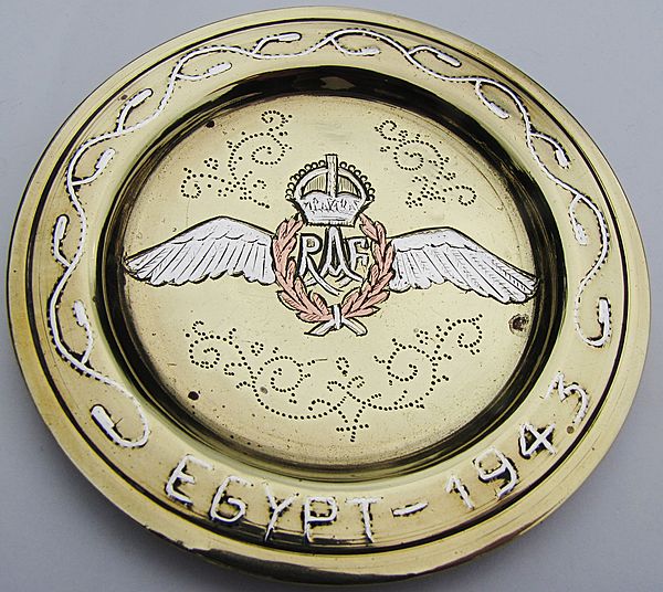 | RAF Trench Art Tray 1943 - We often purchase items of trench art but this little tray is several cuts above most of the examples we see. The tray is made from a heavy lump of brass and beautifully engraved to the centre is a perfect RAF pilots brevet. This is finely worked and unusually the wings and Kings Crown are picked out in silver, whilst the laurel leaves are in bronze. The edge fluting is also in silver as is the wording 'Egypt' and the date 1943. Judging by the quality of the work we believe it to have been made using WWII battlefield scrap by an Egyptian craftsman and sold commercially at the local Souk as a souvenir for an RAF serviceman to take home as a gift for friends and family. We think it fair to describe it as 'small but beautifully formed' and would grace either an RAF or trench art collection. Measures 4.25" diameter (10.5 cm). If trench art is your thing we recommend you check out the fine Royal Tank Regiment example which was purchased from the same source which we are also listing today.