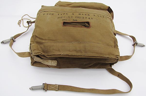 | RAF Dinghy Seat Pack Type A Mk 3* - stores reference 27C/2445 and designed to carry the single-man fighter pilot Type K dinghy which was carried folded within the pack attached to the seat type parachute in place of the usual Sorbo rubber seat cushion. The Mk III* pack was identical to the earlier Mk II but with the addition of an external pouch to house the emergency bail out bottle which was introduced in April 1944. Manufactured in heavy olive drab cotton canvas, broadly rectangular in shape with a separate cover attached with press-studs which are all in mint condition. These packs have internal stowage pockets to house the accessories not carried within the dinghy itself; this example is empty of contents. The exterior of the pack carries a multi-lingual label stitched to the cover with basic operating instructions in English, French, Czech and Polish. The pack is complete with lanyard and quick release connectors to attach to the '41 pattern Mae West. The whole set is in virtually mint faultless condition and would be impossible to improve upon and would certainly match the collectors maxim to 'buy the best you can afford.' Please check out the K dinghy mast and sail as well as the emergency rubber water cushion and inflator which we are also listing today and which would have been originally stored within a similar pack.