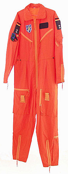 | German Air Force Orange Flight Suit - Manufactured by H. B. Mader GMBH and dated 3/77. National flags and rank insignia attached to shoulders. Squadron attached to right breast with a further unidentified badge numbered 351 to right arm. The size is marked 13, numerous zip pockets and leather clip attachments to knees.