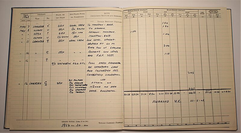Don't just take our word for it just how good this facsimile is and I quote from Amazon. com reviewer J. R. Perkins: "As an historic document, this item ranks up there with the best. Especially if you have an interest in aviation from the Second World War, as Guy Gibson is one of the best known pilots of the Royal Air Force and to have a reproduction of his Log Book is something really special. Some of his less known sorties are listed here, being his time as a night fighter pilot with 29 Squadron flying Blenheims and then Beaufighters defending the skies of England against German night bombers. Truly a very special book to own and treasure. Wing Commander Guy Penrose Gibson VC DSO DFC (12 August 1918 – 19 September 1944), was the first CO of the Royal Air Force's 617 Squadron, which he led in the "Dam Busters" raid (Operation Chastise) in 1943, resulting in the destruction of two large dams in the Ruhr area. He was awarded the Victoria Cross and died later in the war. He had completed over 170 operations at the age of 24. "