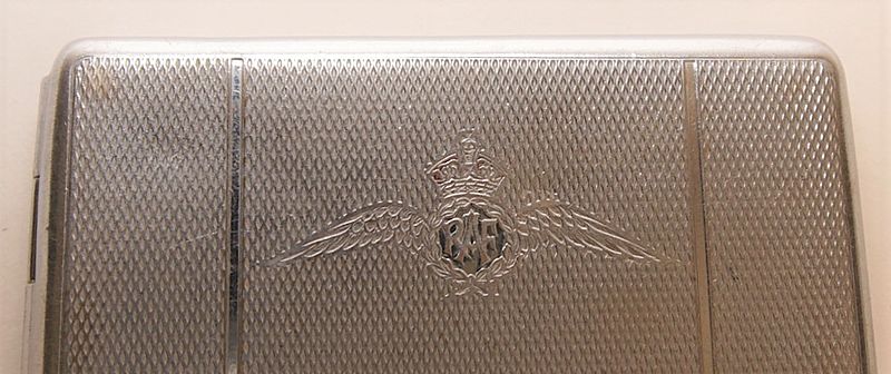 | RAF Engraved Cigarette Case - An excellent example that whist not dated almost certainly originated in WWII. The outside of the case in engine turned and to the centre is a crisp set of RAF wings surmounted by a Kings Crown; whilst the paint is now largely worn away we believe the crown was originally red and the 'RAF' lettering was set against a blue background. The case, which is chrome finished, has the odd bump from usage which is as to be expected but remains in generally good condition with no wear to the chrome and the hinge and spring catch both remain in good working order. The reverse of the catch is marked 'Made in England' and possibly the makers name, which we have been unable to decipher. Inside is equally crisp and the case retains the original elastic for holding the cigarettes in place. What lifts this example well above the norm is a presentation engraving on the inside lid reading :'To Babs with all my love, Al. 'Sadly the history of the piece has been lost down the years but we can only assume this was given by 'Al' to 'Babs' as a present to his wife or girlfriend as a sweetheart gift and in the days when almost everyone smoked and enjoyed up to 40 'Woodbines' a day would have been a functional rather than a r0mantic present! This case would sit happily in any RAF collection and is significantly cheaper then a similar silver example that also turn up from time to time. Measures 3.75" x 3 1/2" (9.5 cm x 8.5 cm)
