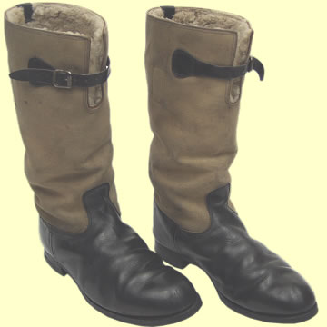 | 1939 Pattern RAF Flying Boots - Stores ref. no. 22C/230. These are perhaps the most scarce and desirable of all wartime boots. Introduced in 1939 as a leather saving option over the 1936 pattern, they were not successful operationally as moisture picked up on the ground was absorbed by the canvas and froze at altitude. Despite this they were favoured by figher pilots and will remain synonymous with the Battle of Britain. This pair are an excellent example and while they are in issued condition, they clearly had a very easy war! The canvas leg section is very clean with only minor scuffing on the right boot. The leather uppers and soles are crisp. Inside the fur is good with only minor wear. The leather pull tags are in place and clearly marked with King's Crown, AM and the manufacturing contract number, indicating a production date of 1939. While these boots are really too valuable to wear, they are a UK size 10 (U.S. 10.5), so they have everything going for them. This pattern and size simply do not turn up on the market in any condition and we will be waiting a long time to find a similar pair. Our price reflects the scarcity of these unique boots.