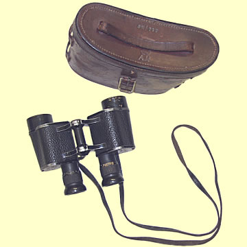 | Observation Binoculars - WWII, RAF issue, in original issue case. Stamped with Kings Crown, AM, ref. 6E/293 on instrument and case. Good optics but would benefit from cleaning.