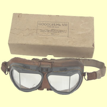 | RAF Mk VIII Flying Goggles - Stores ref. no. 22C/939. This pattern was introduced in late 1943 and continued in service until the 1970's. This example is complete with the original AM stamped issue box (showing some signs of water staining). It contains a spare set of tinted lenses (some fogging) and a de-misting tin and cloth dated 1941.