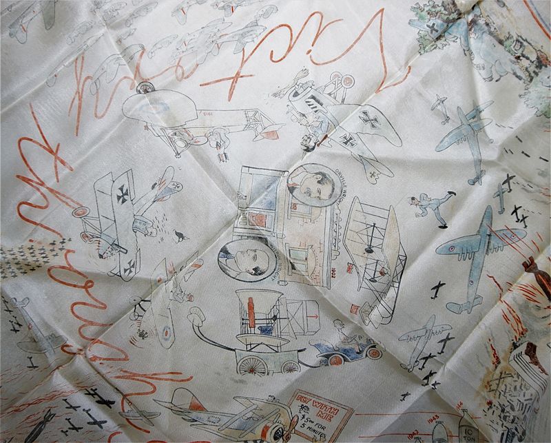 | Victory Through Air Power Propaganda Scarf by 'Glamour Wear' of London - A commemorative headscarf entitled 'Victory through Air Power'. The scarf is printed with illustrations showing the story of flight from the Orville Brothers invention of the 'flying machine' through to the conclusion of the Second World War. Large square commemorative cream-coloured headscarf printed with insignia and aircraft illustrating the story of flight and in each corner is a pilot's brevet for the RAF, RAAF, RCAF and USAAF. In the centre is the phrase 'Victory through Air Power' printed in red and surrounding a depiction of Orville and Wilbur Wright 1902 as 'Inventors of the flying machine' and around this are various illustrations showing bombing raids, crashed aircraft, flying formations and burning cities and factories. The scarf is made of Rayon (probably due to the lack of silk immediately post war) and the edge is finished in short tassels. Printed in one corner of the headscarf is the name of the manufacturer 'Glamour Wear, London'. Jacqmar is perhaps the most famous maker of propaganda scarves but we have been unable to find anything on 'Glamour Wear of London' but we assume this item was manufactured in the early post WWII period to celebrate aviation in general and victory in WWII in particular. The condition is generally good but it does have a few tiny holes and we suspect the colours have faded a little over the years. The range of images depicted are superb and the scarf would display well framed behind non reflective glass. Measures 30" x 30" (76 cm x 76 cm)