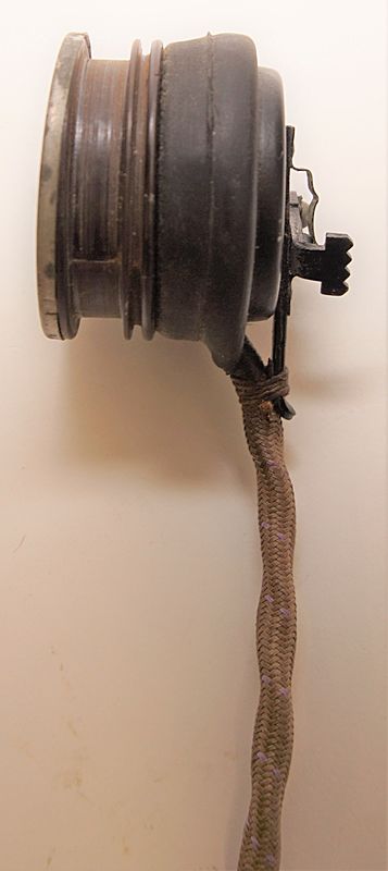 | RAF Type 48 Magnetic Microphone - A standard WWII example of the type fitted to the E, E* and G pattern oxygen masks. It carries an embossed stores reference code 10A/12570 to the face plate as well as the microphone 'On' and 'Off' switch. The microphone is wired up with a wartime specification flecked short cord and a two pin female connector to plug into an internally wired RAF C, D or E pattern flying helmet. A near identical example is shown on page 46 top left of Mick Prodger's excellent Luftwaffe V RAF Flight clothing book. We discovered a small quantity of these in a forgotten warehouse and these appear to never have been issued. Other than a minor mark to the face plate it appears in near perfect condition. Interestingly the box in which this example was discovered has written outside 'checked 30/6/44' and below a further check date of 22/11/44. Like all our kit for sale as a collectable but we would not be surprised if this is not still in good working order -despite the passing of close to 75 years!