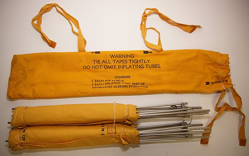 | RAF / USAAF M-357-A Dinghy Radio Kite - Manufactured by the Bendix Aviation Co. from 1941 and issued to both RAF and USAAF aircrew in WWII. Often referred to as 'Aerial Kites' as they were made to lift 260 feet of steel wire from the coil drum on the 'Gibson Girl' emergency transmitter. This was effectively copied from a 1941 captured Luftwaffe issue example which used a winged as opposed to the standard box kite design adopted by the British. The system went into mass production in the USA with an initial order placed for 11,600 sets which became standard issue for multi person dinghies for aircrew operating over sea. The full kit also included a balloon and hydrogen generator, as an alternate to the kite, when wind conditions prevented its use.