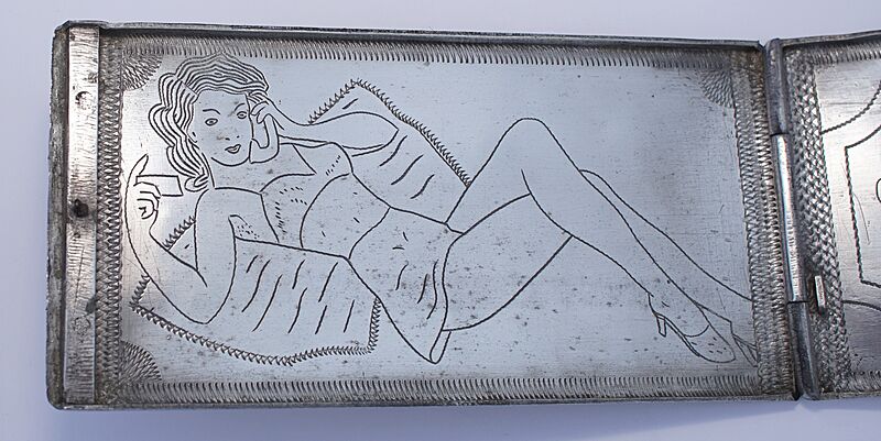 | Air Sea Rescue / 270 Squadron Trench Art Cigarette Case - We have had many examples of trench art cigarette cases here over the years but this has to be one of the best. It is made from what we believe to be scrap aircraft alloy and is very finely worked indeed. To the front is a depiction of an RAF High Speed Rescue launch (HSL) and looking at the design this appears to be based on the Type Two 63' known as the 'Whaleback'. The bows carry an RAF roundel and above the lettering 'ASR' and to the top left corner is a set of RAF Wings. The opposite side is engraved with an RAF Sunderland flying boat passing a steamer below and again finely engraved. The case is opened with a sprung catch to the right side and inside, whilst the cigarette retaining elastic is long gone, this is more than made up for by a reclining female, carrying a calling card and on the telephone. The image seems to be a close depiction of the 'Just Jane' cartoon character created and drawn by Norman Pett in 1932 and of course today proudly displayed on 'Just Jane' Lancaster NX611. The case has various knocks and bumps, commensurate with it's age and use, but is overall in fine original condition. The opposite inside face is engraved with the West African locations of Apapa, Accra, Jui, Oshodi, Gold Coast, Sierra Leone and Nigeria. Above a further name was engraved but this has sadly been ground out, but may have been the original owner with possibly his service number, followed by his surname and intial 'K'.