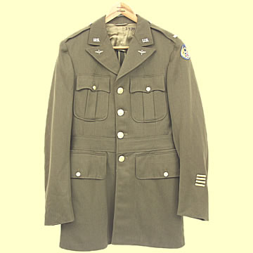 | USAAF 'Chocolate' Tunic - in near mint condition with original badges. This jacket features a "lazy belt" incorporated within the pattern. The lining and interior are very clean and nicely labelled to "Phila. Quarter Master Depot" complete with inspection stamp and clearly dated 20th October 1941. Four embroidered service bars to left sleeve. Chest size 36-38" (91-97 cm). This tunic would be hard to better in any collection.