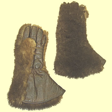 | Flying Gauntlets - RFC, WWI. Very soft "otter" fur outer/leather palm. Full lamb's wool lining. Designed to protect pilot's hands in the open cockpits of the era. Very good issued condition.