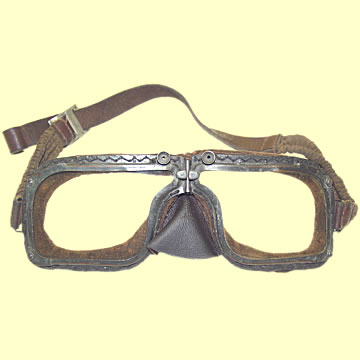 | Flying Goggles - RAF, Mk VII, tinted lenses and complete with flip-up Polarizing Screen, standard issue in tropical flying zones. This pair is a rare early example with sprung leather backstrap, c. mid 1942.
