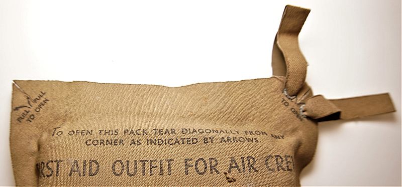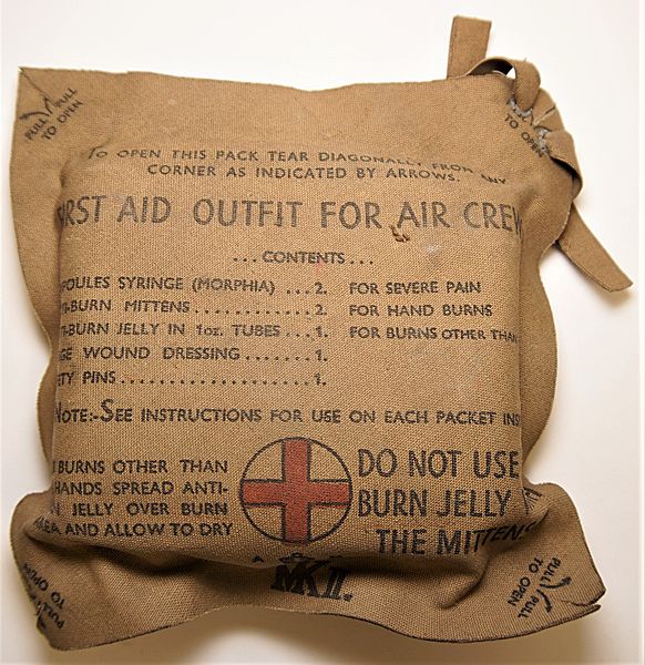| RAF First Aid Outfit For Air Crews Mk II - These packs are becoming increasingly rare and few now turn up as crisp as this example. Designed to be carried by all aircrew in a designated pocket in their service or battledress uniform and were introduced following lessons learned during the Battle of Britain. Burns to aircrew were the most common types of injuries and the rubberised sealed canvas pack contained cotton bandages, ampoules, anti-burn Mitten impregnated with antiseptic ointment, anti-burn jelly in a 1oz tube, large wound dressings and safety pins.