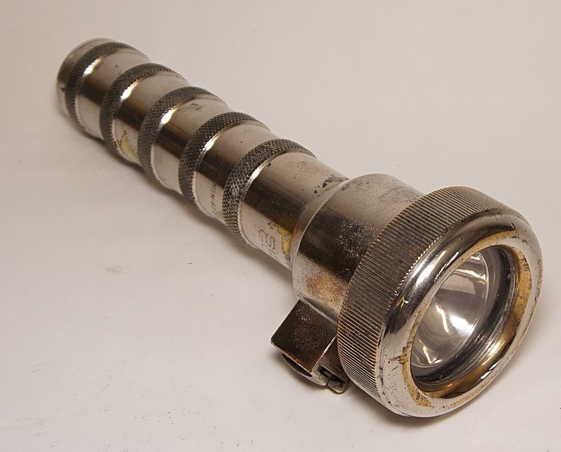 | Siebe Gorman Admiralty Issue Diving Torch NSN-6230.99-520-1611 - Siebe Gorman & Co Ltd, arguably they most famous name in diving, have manufactured hand-held battery powered submarine electric torches for divers and the British Ministry of Defence since the 1920's. We have sold countless examples over the years but these have been exclusively the type most commonly found, normally with a chrome leather wrist-strap which is sewn on, with a bulls eye lens and four metal 'prongs' to protect the glass lens.