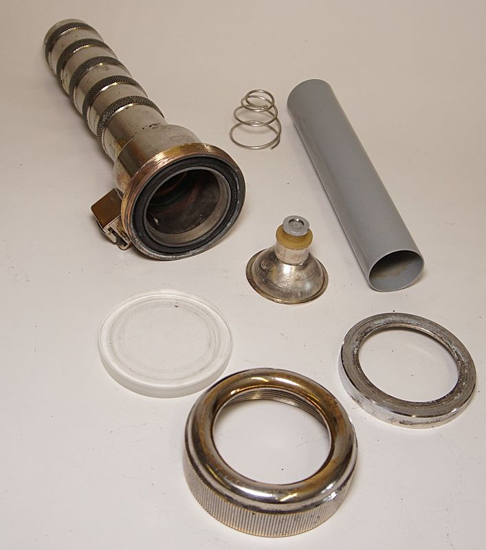 This torch supersedes the previous design and improves on it. A large separate 'O'-ring seals the lens housing; the batteries are isolated in a grey painted and non-conductive inner metal tube, and is complete with a conical compression spring at the end of the battery housing to lock three 'D-size', 1.5 volt dry cell batteries in place. These would give a maximum burn time of 1 to 2 hours. The torch is not fitted with batteries and we can't warrant if it is still in working order so for sale purely as a collectable. The rugged, simple construction of all Siebe Gorman Military issue torches enables them to operate within the depth parameters of most normal Royal Navy diving limits and is safe to operate down to 80 meters. Unlike on later torches it does not carry a wrist strap but there is a lanyard hole on the curved metal end plate which is stamped on this torch with an 'X' which we speculate is a Royal Navy quality acceptance mark. The torch measures 11" long (28 cm) and the diameter of the lens end is 3.25" (8.5 cm) It weights a hefty 4.0lbs without batteries (1.8 kilos)