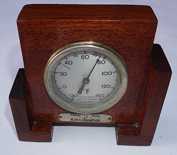 | HMS Champion Temperature gauge - Purchased from a defunct West county Naval museum this small item of treen is made from teak recovered from HMS Champion, when she was broken up by Metal Industries of Rosyth, Scotland in 1933. HMS Champion was a C-class light cruiser of the Royal Navy that saw service during World War I. She was part of the Calliope group of the C class and Champion was commissioned into service in the Royal Navy on 20 December 1915. She was assigned to the Grand Fleet, serving as the leader of the 13th Destroyer Flotilla through to early 1919. She fought in the Battle of Jutland in 1916, during which she was also the flagship of the senior commander of the fleet's destroyers. She served on post war but was decommissioned in December 1933 and placed under dockyard control and finally sold for scrapping the following year.
