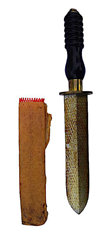 It features a straight through tang and a double-edged spear point blade with simple brass quillon. The blade remains greased, thus endorsing the fact it has never been issued and for the sake of authenticity we have not attempted to remove or clean the blade. The pommel is made from brass and the nut fits tightly onto the black 6 ring "Ebonite" ribbed grip, which like the blade remains in near mint condition.