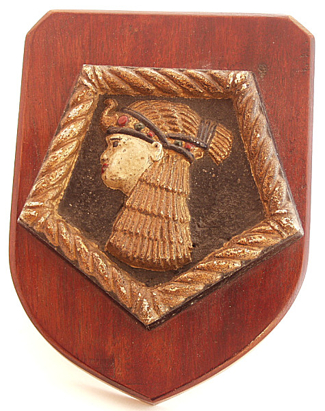 | Boat Badge from HMS Cleopatra - Seven ships of the Royal Navy have carried the name Cleopatra which this badge almost certainly came from the D class cruiser of 5, 450 tons which was launched in 1940 and finally went to the breakers in 1958. The badge is made from alloy (common during WWII) and the relief is picked out in the original paint. Since being removed from one of the ship's boats, it has been nicely mounted on a mahogany display shield. Cleopatra was adopted by the town of Harrogate and she served with distinction throughout WWII and won battle honours on Malta convoys and for Sirte (1942) and for Sicily in 1943. Badge measures 5.5" (14 cm)