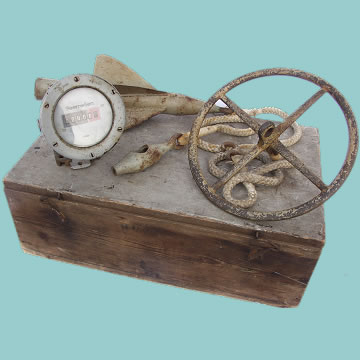 | Kreigsmarine Ship's Log in fitted case - A scarce example and only the second one we have ever seen offered for sale. The register dial is named to the well known nautical instrument manufacturer W. Ludoph who have been operating from Brenerharven for over 150 years. The dial interestingly features a digital display which must have been an advanced feature 70 years ago. Above the scale is written Seemeilen which translates to mean nautical miles. The bezel is embossed with a clear Waffen Ampt stamp and the numbers 2708 and WB12366. The register is made from an alloy and is finished in Kreigsmarine field grey paint. The fitted pine deck box also contains a shoe (mounting device), a traff rail log governer, rotator, hooks and cordage. The metal parts show some rust but the set is in "sleepy" condition, exactly as it must have been when it came out of service. The register appears to be in working order but is for sale as a collector's item.