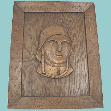 | Prisoner of War Carving - This plaque originated from Scotland and we are told it was presented by a German POW to a local civilian during WWI. It depicts a German soldier in a period combat helmet carved in relief from hardwood. This is mounted on a quality oak frame which appears to be contemporary. We are sure it must have an interesting story to tell! Frame measurements: 25 cm x 20 cm.