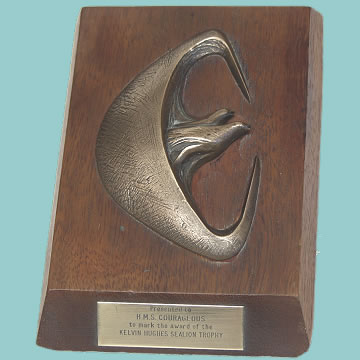 | HMS Courageous Presentation Plaque - To mark the award of the Kelvin Hughes Sea Lion Trophy. Courageous was a Royal Navy nuclear powered submarine in service from 1970 and paid off in 1992. The trophy was presented annually by Kelvin Hughes, the marine division of Smiths Industries, for top performance in torpedo marksmanship in the Royal Navy submarine service. Winning crew members received, as well as the trophy, a tie carrying the same motif and a bulkhead plaque was retained on the boat. This award was first introduced in 1975. The award is in the form of a double sea lion motif in relief set on a mahogany base and to the front a brass plaque confirming the award to HMS Courageous. 7" x 5" (18 cm x 12 cm)