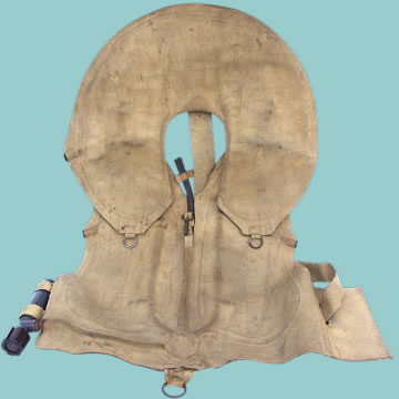 | Kreigsmarine Issue Schwimmveste - These lifejackets were issued to both surface and u-boat crews and photographic evidence exists that they sometimes found their way onto Luftwaffe air sea rescue aircraft. This example is in good issued condition with rubberised canvas finished in beige and fitted with the correct fastening straps. It comes complete with the gas inflation bottle which is stamped 16908, H and dated 6.44 as well as a swastika and M. The jacket itself carries a Waffen Ampt ink stamp and also has manual inflation points. The main inflation tube is in place but the stopper is missing and exhibits signs of perishing. Whilst not mint, this is an excellent display example and is becoming increasingly hard to find in any condition. Not warranted for its original use!
