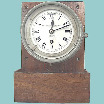 | Smiths 8 Day "Convoy" Clock - by Kelvin Hughes of WWII vintage. While the original wiring is incomplete, the electrical contact ring is in place. The clock is mounted on a crude, yet correct, wooden box which is complete with the buzzer. The metal case is finished in battleship grey with the code SL.68 written on the reverse. This is the most complete example of a "Zig Zag" clock that we have had – many ended their days at the bottom of the North Atlantic! The movement has been cleaned and is in good running order.