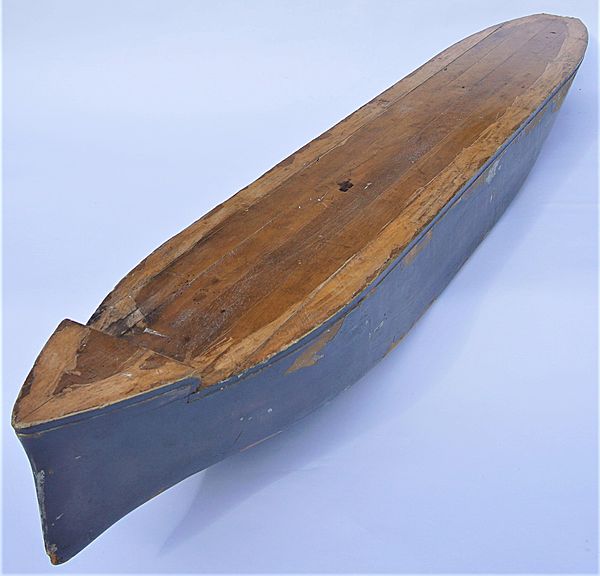 Sadly we have no idea what vessel she represents but was clearly a significant vessel. The hull carries the original grey paint that is showing significant age wear but this reflects the 'chabby chic' look currently favoured by interior designers. We have left it exactly as it came to us but the paint could easily be stripped and the hull waxed and polished but we will leave that decision to the new owners. The deck remains unpainted and carries hatch pencil marks, we assume drawn by the ships architect. We considered for a moment sectioning the model and mounted on appropriate hardwood back it would make not one but two block models but again we prefer to leave it in its original state. It is quite an impressive size measuring 59.5" stem to stern (151 cm), a beam of 9" (23 cm) and she stands 5" from the base of the hull to her deck (13 cm). Despite her history being lost a large and impressive model with loads of display potential.