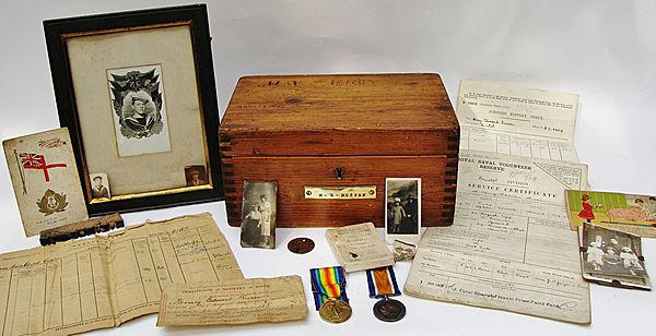 | WWI RN Submariners Ditty Box with Original Contents - Over the years we have purchased a number of ditty boxes but almost always they are empty and more often than not their history has been lost over the years. Here we have the exception that exudes period charm and the full history of the WWI owner at every turn! It was issued to Able Seaman H.E.Russen who served in WWI in Submarine service, which in itself makes it a very scarce item indeed. The box is in pitch pine of standard form with a brass plaque to the front stating H.E. Russen as original owner. He was obviously taking no chances as he has written and carved his name/ initials all over the box! It still has the lock fitted but as we often find the lugs have been cut..perhaps when he or others lost the key. The pen compartment and letter bars are in pace and inside is in good issued condition. The contents we found inside are something else! These include a family photographs, his ID disc confirming he enlisted in the R.N.V.R in Bristol and his service number was Z/6664. We also have his service record which shows he served on Victory, Dolphin, and HMS Crescent. His Conduct Sheet indicates he was transferred to submarine K 10. Submariners were 'Volunteers Only' and the class being designated 'K' it was known by her crews as 'K for for Kalamity' or 'K for Killer' and Russen seems lucky to have survived the war! Interestingly his service certificate shows he had a final share of a naval prize fund paid in 1922 & 23. To conclude we also have his birth certificate, named WWI War and Victory medals, postcards and even an ink stamp engraved H.E.Russen. To conclude the grouping we also have a framed photograph of an Able Seaman with cap band reading HMSubmarine and on the back an inscription reading:'Ruby's Dad-Henry Russen'. The is best named ditty box collection we have ever had or are ever likely to have and clearly worthy of further research. A full set of photographs of the box and contents can be supplied on request. The box was purchased in Bristol and we assume consigned by descendants of Able Seaman Russen but what a shame such an archive was not kept and treasured by the family. Box measures 12"x 8"x 6" (30 cm x 20 cm x 15 cm)