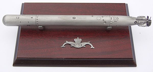 | Royal Navy Model Torpedo on Stand - this example is beautifully made in solid metal, sitting on a mahogany fitted base with the Royal navy Submarine Service logo in front. I have no history with this one but speculate it represents on of the Navy's more modern torpedo's..perhaps Tigerfish ? If any visitors to the site with more knowledge than us please drop us a line and we can update the description. Suffice to say this is a beautifully executed model and would sit very happy on an Old Salt's Desk of book shelf! Torpedo measures 8" (20 cm)